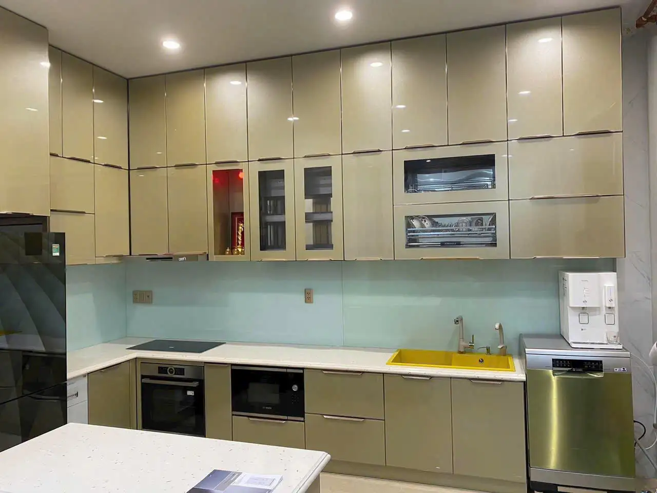 Tại Tủ bếp THIỆN QUÝ bạn có thể lựa chọn màu sắc cánh kính nguyên bản hoặc màu sắc theo sở thích, để tạo màu sắc chúng tôi sẽ phủ lên bề mặt kính một lớp sơn màu đơn sắc tùy chọn theo ý thích của khách hàng. Công nghệ sơn hiện đại sẽ giúp của kính của bạn trở nên láng mịn, không bị xỉn màu hay bong tróc, sử dụng được lâu dài.